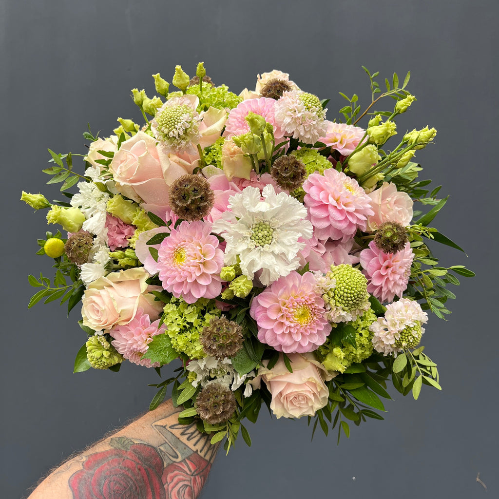 A beautiful bouquet filled with all that is gorgeous in the shop, and in our favourite colourway pink! In this bouquet Pom Pom Dahlia, Hydrangea and even a few Raspberries! Variation with stems selected on the day, but the colour will always be pink.
